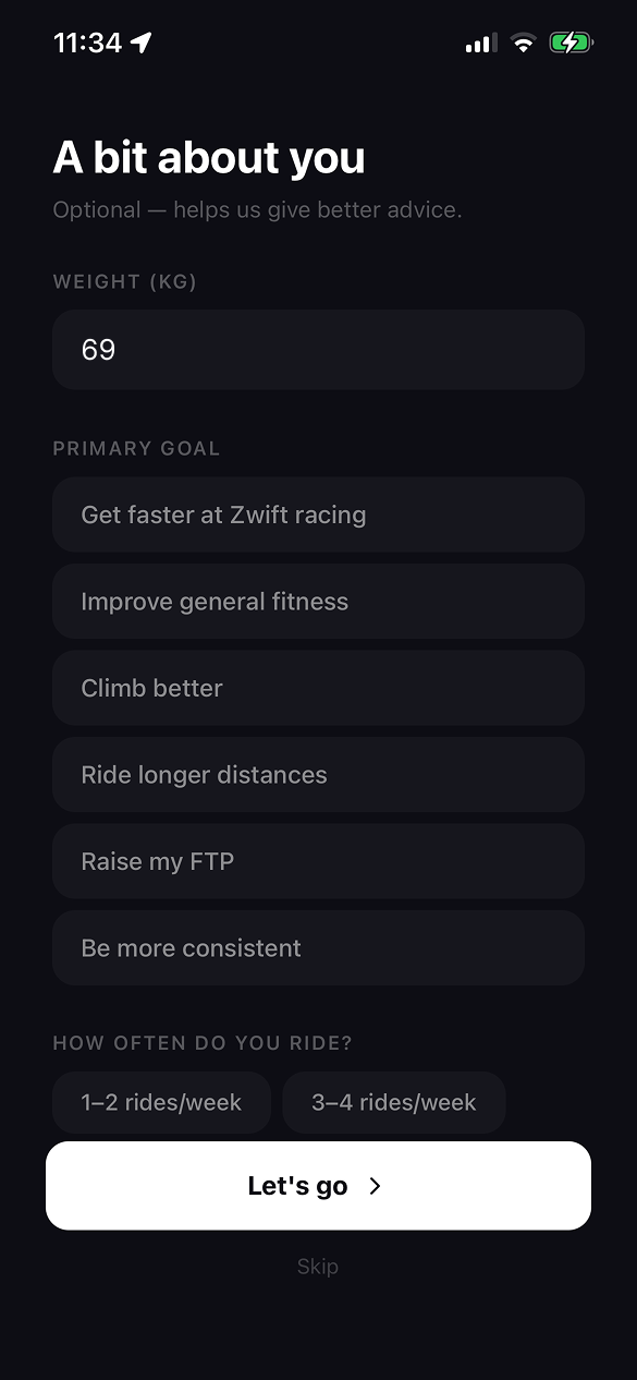 A sportive, a race, a climbing goal, general fitness — everything Swanny does from here is shaped around what matters to you.