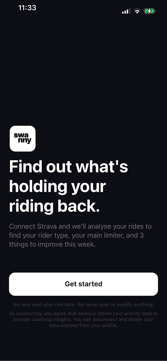 One tap. We only read your rides — never post or touch anything. Swanny needs to see your training to look after you.